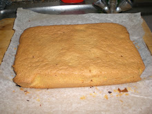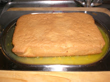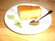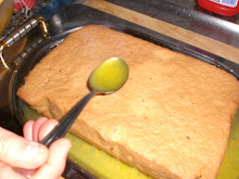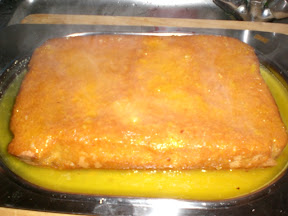 Tirato fuori dal forno il dolce sformarlo, versare un pò salsa in un vassoio o piatto con i bordi alti. A questo punto appoggiare il dolce sopra la salsa,versare il resto della salsa uniformemente sul dolce ed infine decorare a piacere con delle fettine d'arancia(che io in questa non ho messo per motivi di tempo). Ed ecco la fetta..